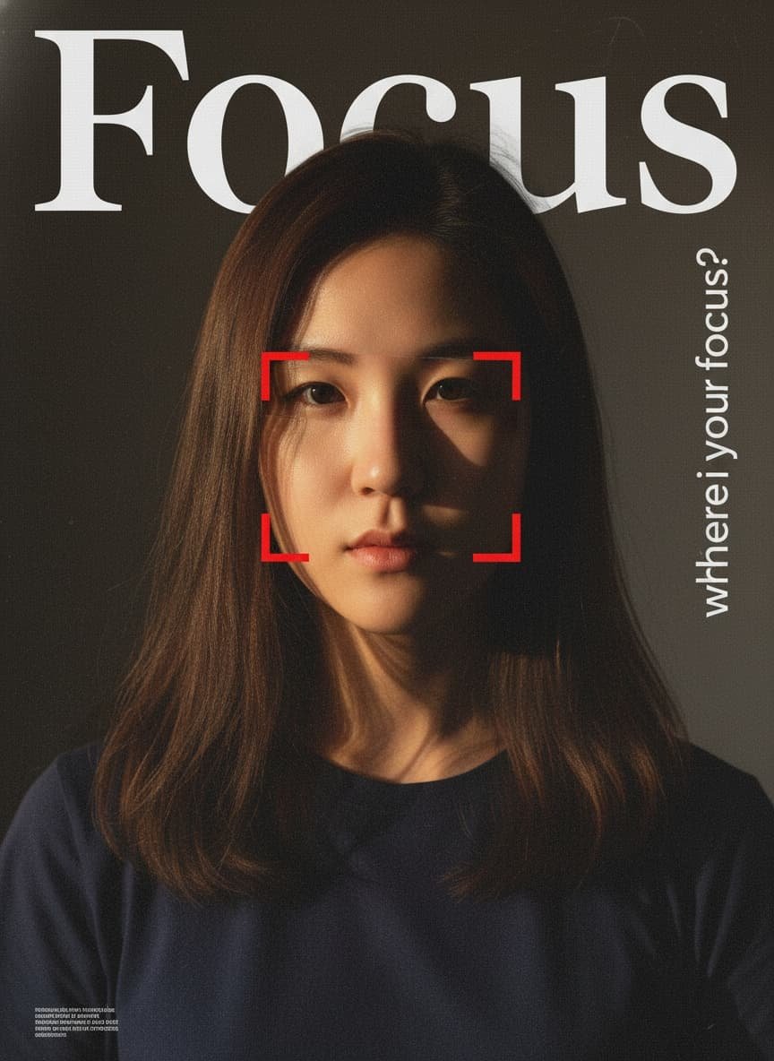 "Large artistic display typography headline at the top: \"Focus\" (ornamental, editorial, high-end, not a plain serif)",