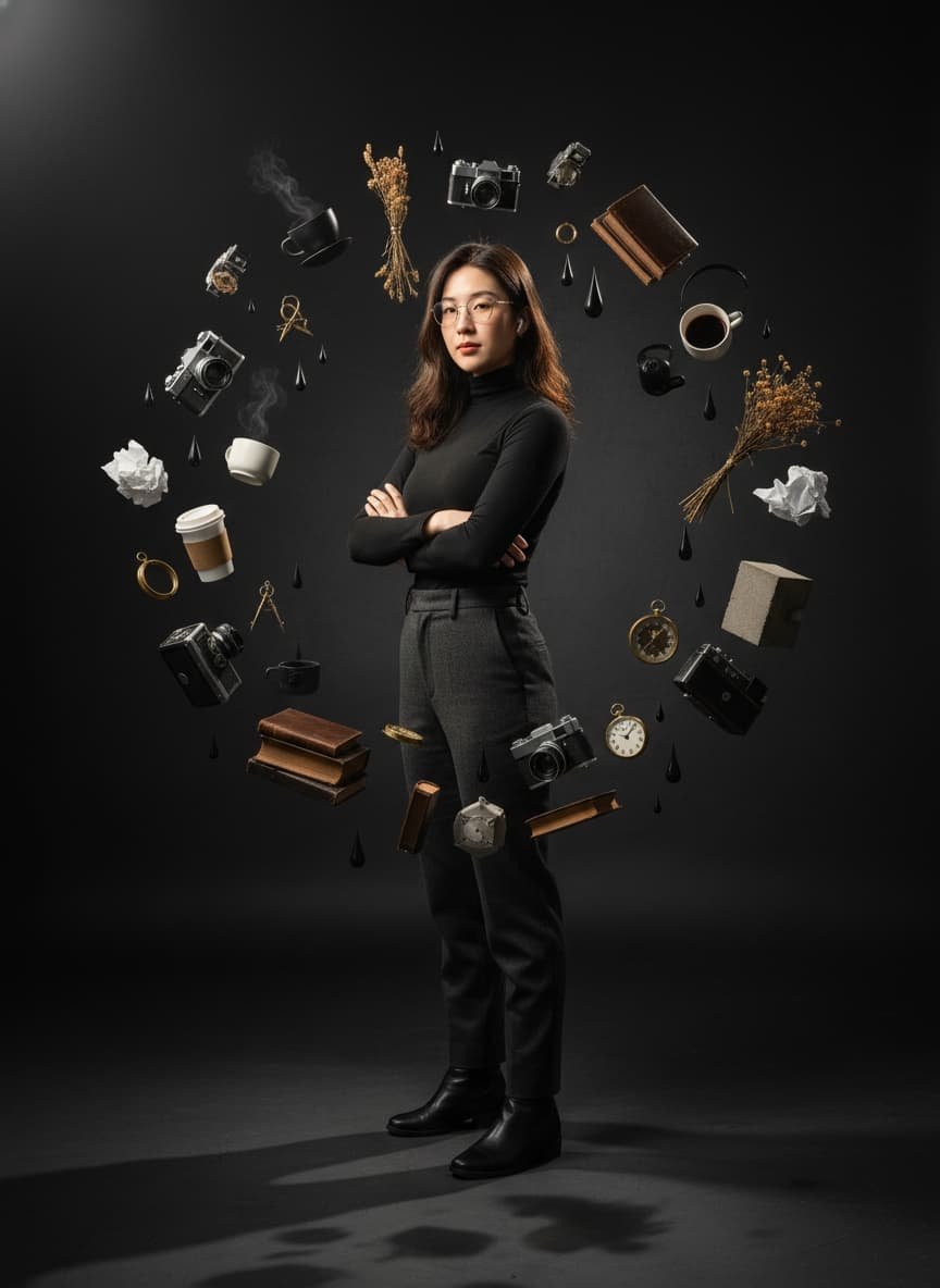 "output_goal": "Create a hyper-realistic cinematic studio portrait of a woman surrounded by floating everyday objects in a surreal gravitational composition, preserving her exact identity while blending elegance, mystery, and controlled chaos."