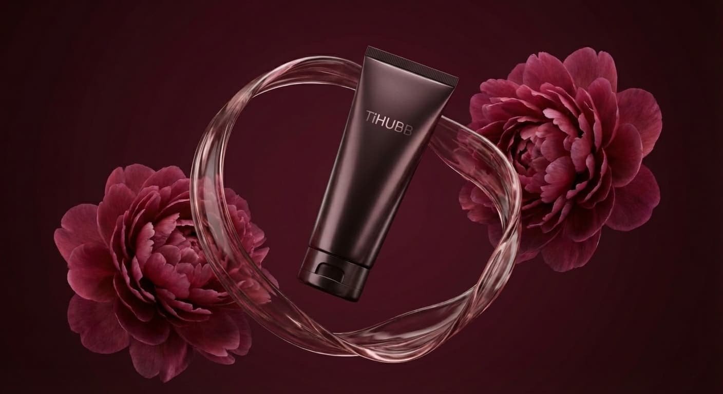 A luxury beauty cinematic animation. Start with a deep burgundy background in complete stillness. Soft studio light slowly fades in, revealing a premium TiHUBB cream tube floating diagonally in the center. Two fully bloomed deep-rose peony flowers remain stationary on either side, ultra-detailed petals gently breathing with subtle natural motion. A translucent, glass-like rose-tinted liquid ribbon begins to flow in slow motion around the tube, forming an elegant circular orbit. 一段奢华美妆的动画短片。画面以深酒红色的背景静谧开场。柔和的摄影棚灯光缓缓亮起,一支TiHUBB高级面霜斜置于画面中央。两侧各有一朵盛开的深玫瑰色牡丹花,花瓣纤细精致,微微颤动,呈现出自然的呼吸感。 一束如玻璃般晶莹剔透的玫瑰色液体缓缓环绕面霜,形成优雅的圆形轨迹。
