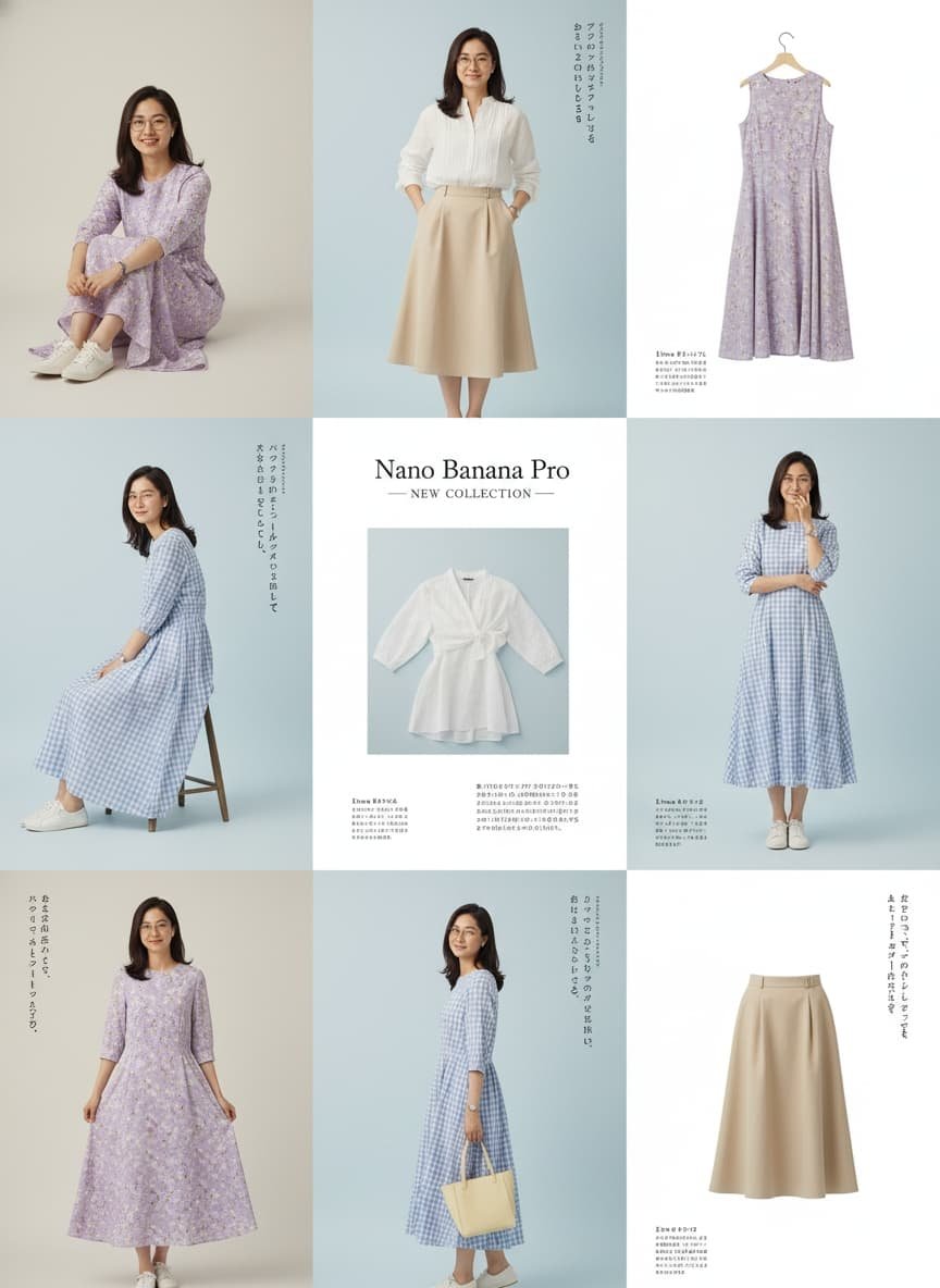 masterpiece, best quality, ultra-detailed, 9-panel grid layout, Japanese fashion magazine style, "TiHUBB / Gemini" aesthetic. The grid showcases a fashion collection. The main subject is a ref photo **Panel Layout:** - **Panels 1, 2, 4, 5, 7, 8:** Feature the model in different poses looking at the camera. She is wearing different outfits from the collection. - **Panels 3, 6, 9:** Are clean, standalone product shots of individual clothing items from the collection, displayed on a simple white or light blue background. **Overall Aesthetics:** - **Background:** Clean, minimalist, mostly white or pastel light blue. - **Lighting:** Bright, soft, high-key, natural light, creating a fresh and airy feel. - **Color Palette:** Soft pastels, gentle tones. - **Composition:** Clean, organized, with plenty of white space. Include small Japanese typography elements for titles or descriptions. **Collection Items (Example):** The collection includes a [light purple floral midi dress], a [white linen blouse], a [beige A-line skirt], and a [light blue gingham check dress].