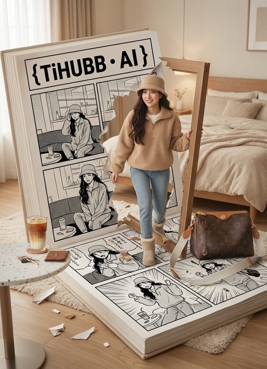 In the ultra-realistic 8K scene, the person in the photo walked out and broke the panel frame of a giant open Japanese version of the comic book called "{TiHUBB · AI}" lying on the floor of the aesthetic bedroom. The comic page depicts a surreal 4-panel Japanese version of the black-and-white comic, with screen tone, bold ink lines and authentic Japanese layout (read from right to left). According to the content and character design in "{TiHUBB · AI}", it features a comic version with the same person trapped in it, wearing, styling