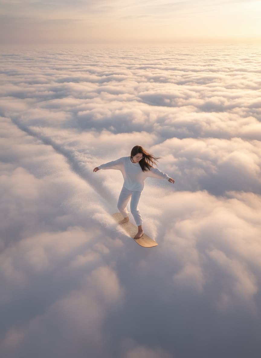 A hyper-realistic, 8k, high-angle wide shot captures a person gracefully snowboarding across an endless, ethereal sea of fluffy cumulus clouds, stretching to the horizon. The subject, wearing a loose-fitting all-white long-sleeved shirt and matching pants, is barefoot on a sleek, light-colored snowboard, creating a subtle cloud 'spray' as they move, illustrating the surreal physics of clouds acting as a solid, surfable surface. Their long hair flows dynamically behind them, indicating motion. The lighting is cinematic and warm, characteristic of golden hour, with soft, directional light casting gentle highlights and subtle rim lighting on the subject and the highly detailed textures of the clouds, creating a sense of volumetric depth. The composition is dynamic, with the subject positioned off-center, moving diagonally across the frame, emphasizing the dreamlike quality of the scene. uploaded face as reference. 一张超逼真的8K高角度广角照片捕捉到一个人优雅地滑过一片绵延至地平线的蓬松积云,宛如一片空灵的海洋。照片中的人物身着宽松的白色长袖衬衫和配套长裤,赤脚踩在光滑的浅色滑雪板上,滑行时激起阵阵云雾,展现出云朵如同坚实的冲浪板般梦幻的物理特性。他飘逸的长发在身后动感地舞动,更添动感。画面光线温暖而富有电影感,呈现出黄金时段的典型光线,柔和的定向光为人物和云朵的纹理投射出柔和的高光和微妙的轮廓光,营造出丰富的立体感。构图动感十足,人物位于画面中心偏外,斜向移动,进一步强化了梦幻般的氛围。(上传了人脸作为参考。)