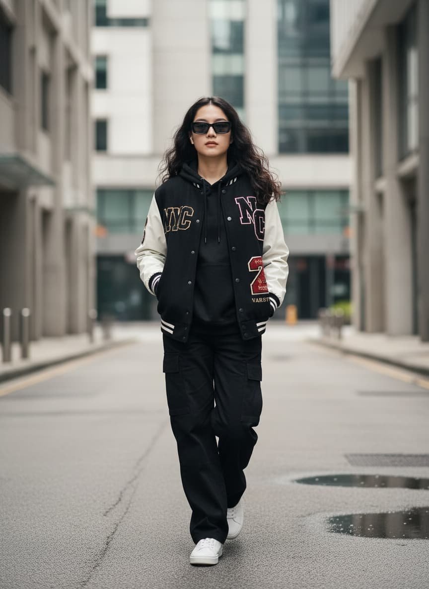 A realistic cinematic street fashion photo of a stylish young woman walking confidently on a quiet city street. He has curly textured hair, light stubble, and is wearing black rectangular sunglasses. His outfit includes a black varsity jacket with white sleeves and bold letter patches, layered over a black hoodie. He is also wearing black cargo pants and clean white sneakers. The young woman is walking forward with one hand in his jacket pocket, giving a relaxed confident attitude. The background shows a soft blurred urban building with neutral tones, creating a modern city vibe. The lighting is natural daylight with soft shadows, giving the scene a fashionable editorial look. Ultra realistic, street photography style, sharp focus, cinematic depth of field, natural colors, high detail, fashion magazine aesthetic. 一张极具电影感的街拍时尚照片,一位时尚的年轻女子自信地走在一条静谧的城市街道上。她留着卷曲的头发,略带胡茬,戴着黑色矩形太阳镜。她身穿一件黑色棒球夹克,白色袖子上饰有醒目的字母贴片,内搭黑色连帽衫。下身穿着黑色工装裤和干净的白色运动鞋。 这位年轻女子一只手插在夹克口袋里,步履轻盈,自信满满。背景是一栋色调柔和的城市建筑,营造出现代都市的氛围。自然光和柔和的阴影赋予画面时尚大片般的质感。 超写实的街拍风格,清晰的焦点,电影般的景深,自然的色彩,丰富的细节,时尚杂志般的审美。